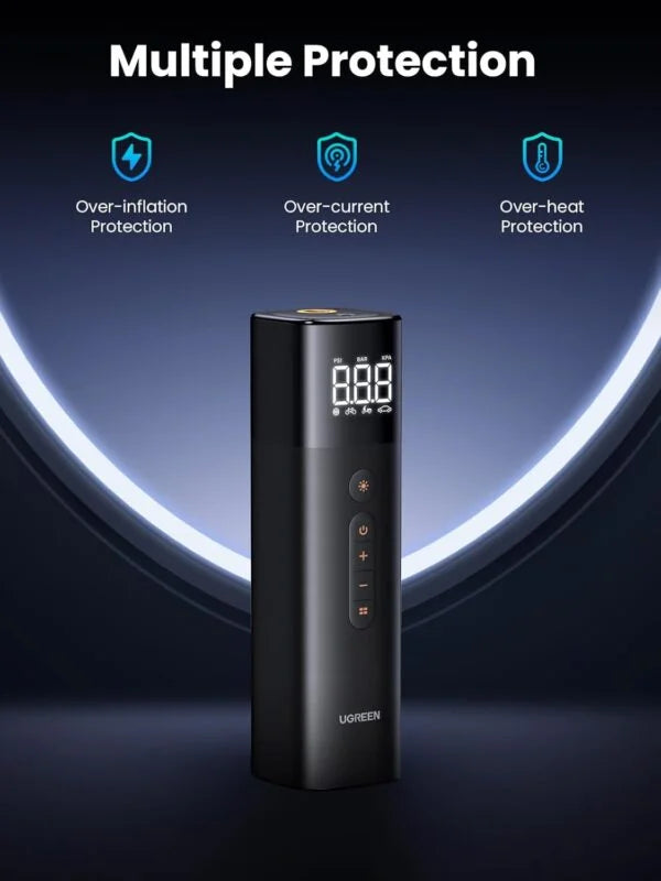 Safety Protection Features: The portable Tyre Inflator has intelligent safety features that automatically cut off the airflow when the inflation reaches the preset air pressure to prevent overinflation. Additionally, our inflator pump has an overheat protection function that immediately stops the device from working if it detects the device’s temperature is too high, ensuring safety