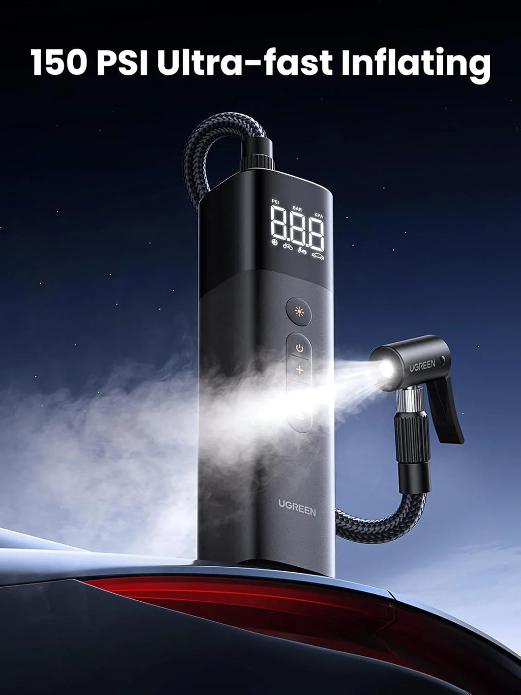Efficient Power Supply and Portable Design: UGREEN electric air pump provides a rapid 30L/Min airflow, reaching a max pressure of 150 PSI, and drawing power from the car’s cigarette lighter via a car charger cable, and with a fuse for added safety protections. The air pump is designed with a compact and portable body, the power cord and air hose are both easily detachable for convenient storage and portability
